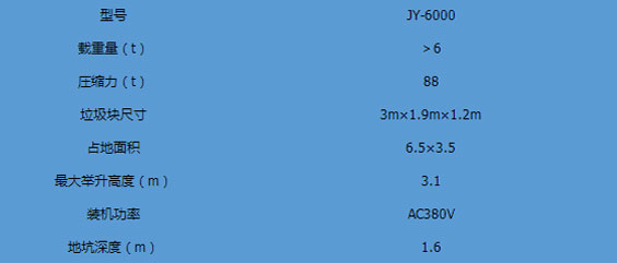 地埋式垃圾中轉(zhuǎn)站主要特點(diǎn):1.平穩(wěn)可靠:兩側(cè)舉升,剪叉跨度大,升降平穩(wěn),無傾斜。2.全封閉水平壓縮:垃圾壓實(shí)密度≧0.86t/m,大幅度節(jié)約轉(zhuǎn)運(yùn)成本。3.淺地坑:地坑深度僅為1.55m,保潔及維修極為方便。4.高效率:壓實(shí)每噸垃圾時(shí)間≤10min。 主要技術(shù)參考:型號JY-6000載重量(t)>6圧縮力(t)88垃圾塊尺寸3m1.9m1.2m...